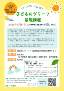 2026年3/月14日(土)午前に「子どものグリーフ基礎講座」を開催します(一般公開講座:主催 NPO法人こどもグリーフサポートふくおか/共催 なや診療所)